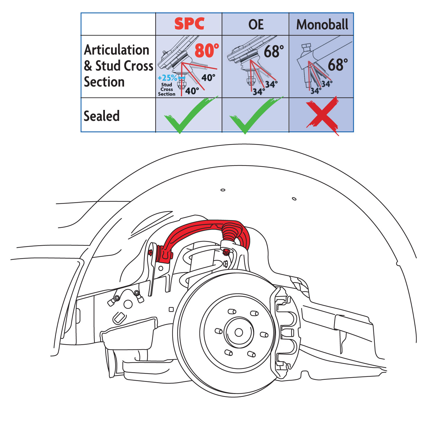 A Forged steel design provides the strength and durability needed for the most demanding environments. SPC adjustable control arms have improved clearance to get around the spring bucket and a full 80° of articulation in the ball joint.