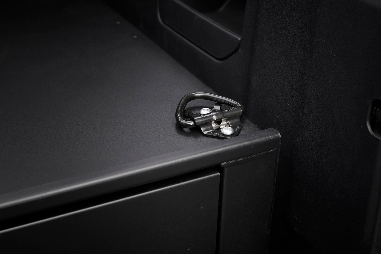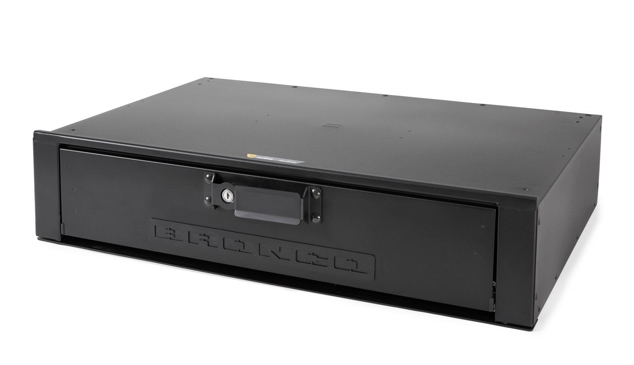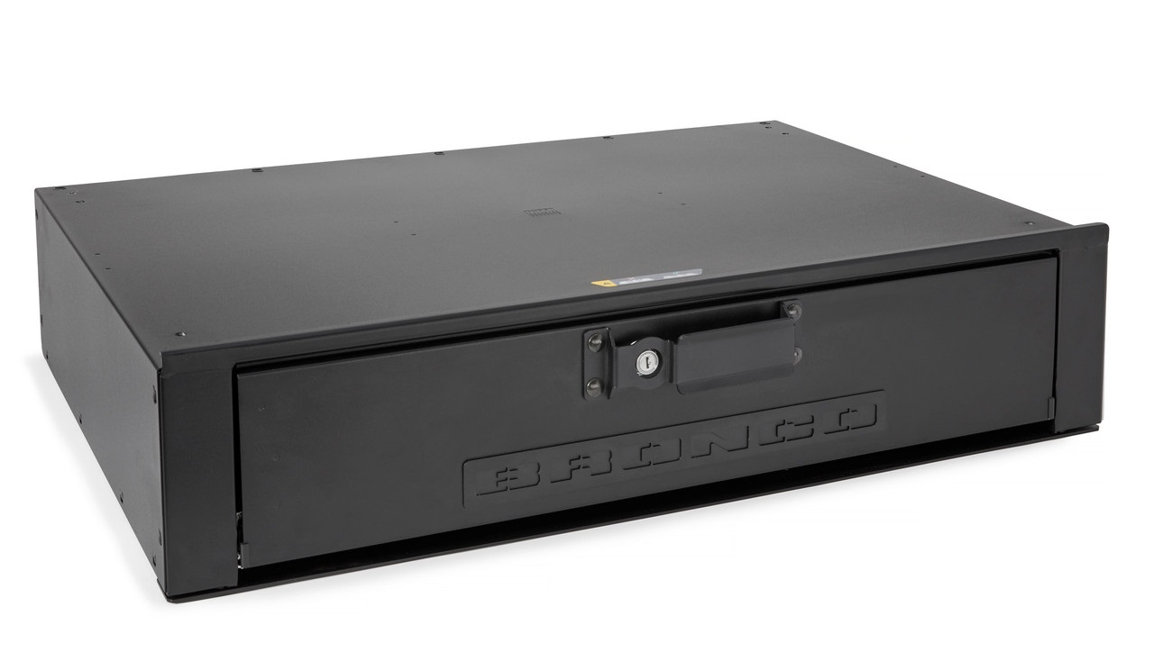 This heavy duty, high security, welded steel drawer mounts behind the rear seat in a 5-Door Ford Bronco. The large drawer slides on heavy duty roller bearings and can be securely locked. The Cargo Drawer has a carpet lined floor providing protection for tools, gear, and other valuables. Dividers are standard and the OEM tie down rings can be reused and mounted to the top of the enclosure adding more versatility to this robust security cargo drawer.