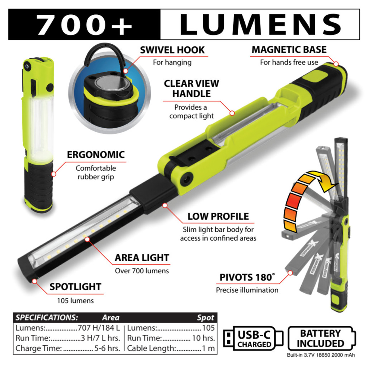 Versatile LED work light featuring a folding neck, a clear view handle, and up to 7 hours of runtime.