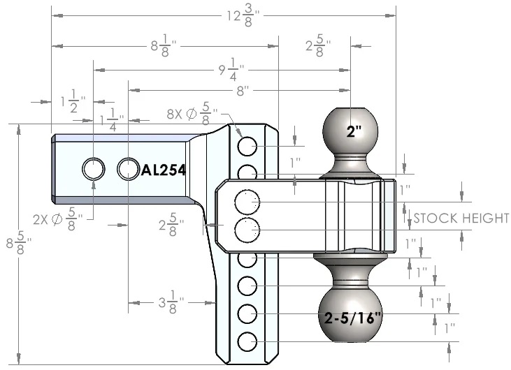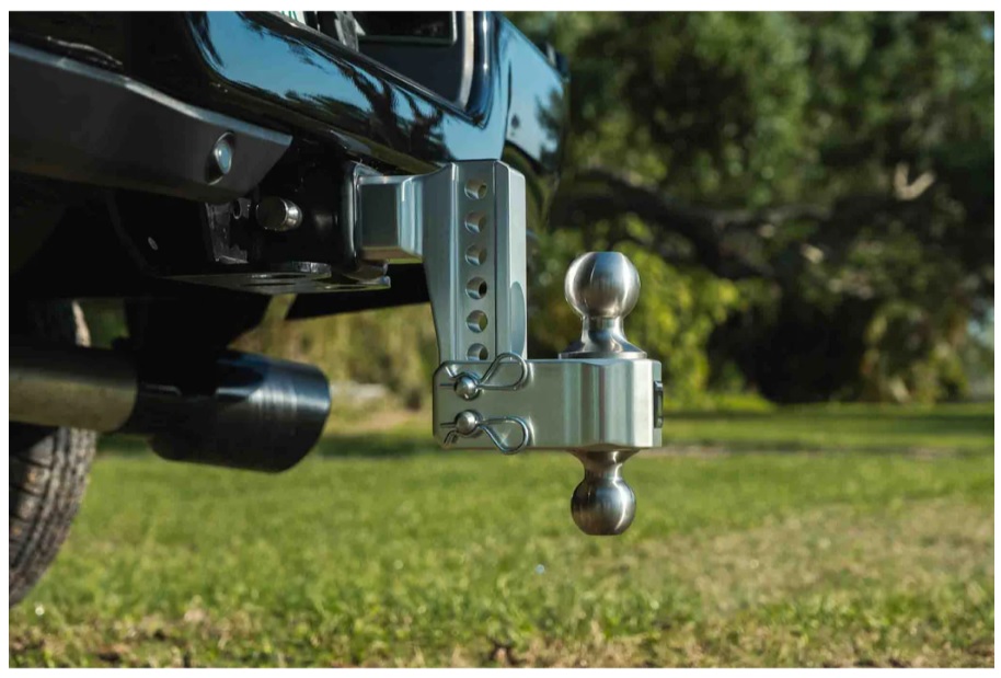 This aluminum hitch comes with their stainless steel 2” & 2-5/16” dual ball that is adjustable in 1” increments. Includes two 5/8" corrosion resistant pins and R-clips to secure it into the channel.