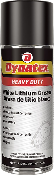 Dynatex® White Lithium Grease Spray is a high-grade lubricant based on white lithium soap with PTFE for heavy duty applications. Ideal for moving parts in metal or plastic. It has a double effect: on the one hand it sprays like oil and has penetrating characteristics and on the other hand it sets like grease and has good adhesive properties and good pressure resistance. Waterproof and protects against corrosion. Suitable for vertical applications and does not drip.