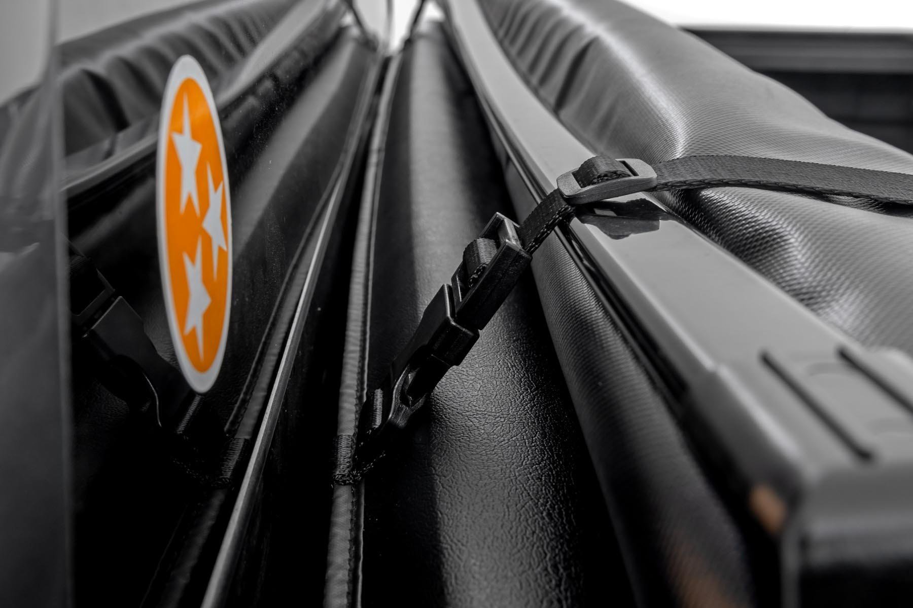 More Information Est. Install Time 10-15 minutes Style Soft Tri-Fold Material Leather-Grain Vinyl Exterior Finish Textured Frame Structure Lightweight Aluminum Latching Mechanism Quick-Clamp Locks Locking Type Tailgate