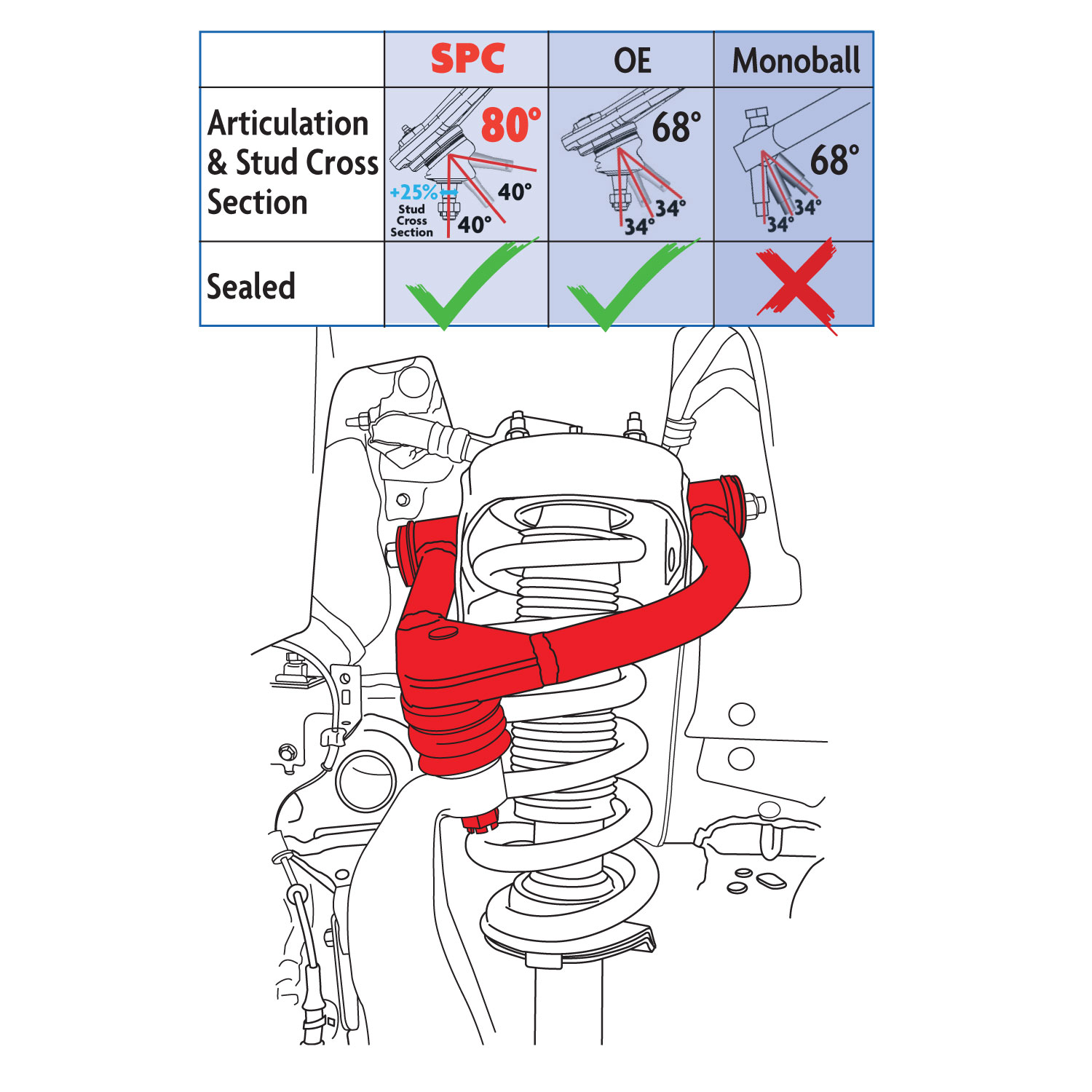 A tubular steel design provides the strength and durability needed for the most demanding environments. SPC adjustable control arms have improved clearance to get around the spring bucket and a full 80° of articulation in the ball joint.